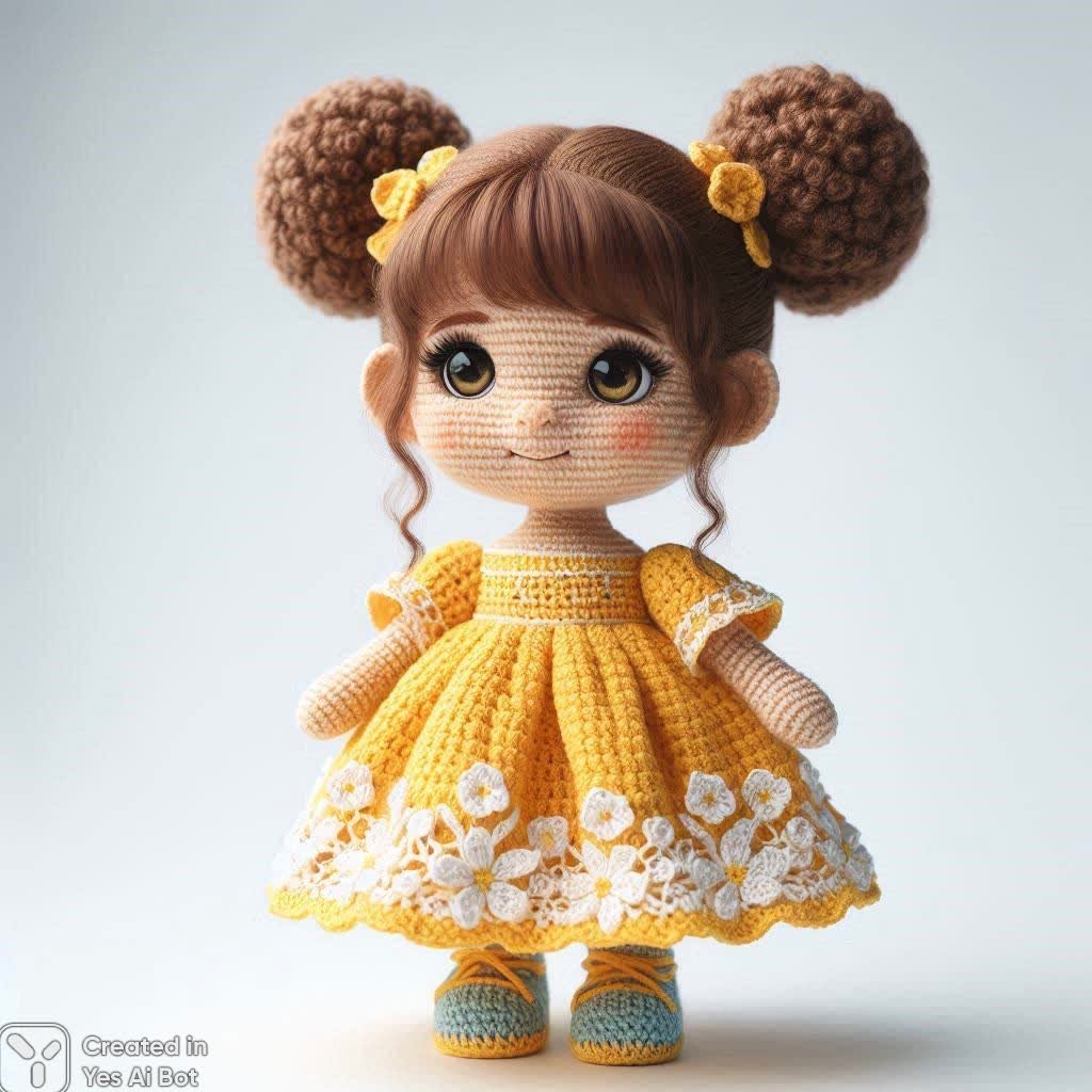 dalle Кукла амигуруми в жёлтом платье с цветами и косичками. Генерация из нейросети Dalle 3