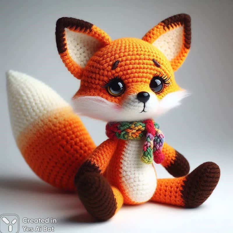 Очаровательный вязаный лис: уютная игрушка с шарфиком и яркими деталями - Пример генерации нейросети Dalle 3