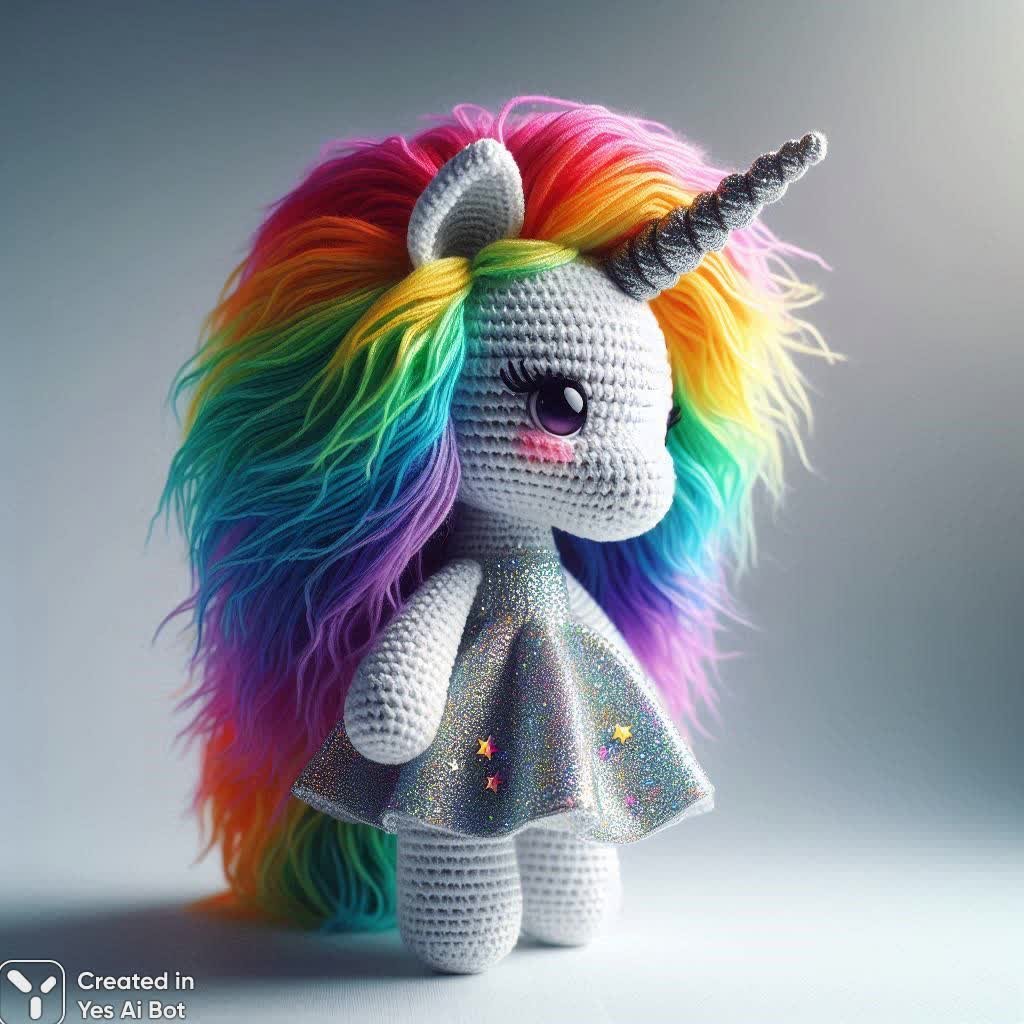 Радужный единорог: вязаная кукла в серебряном платье со звездами - Изображение, созданное нейросетью Далли 3