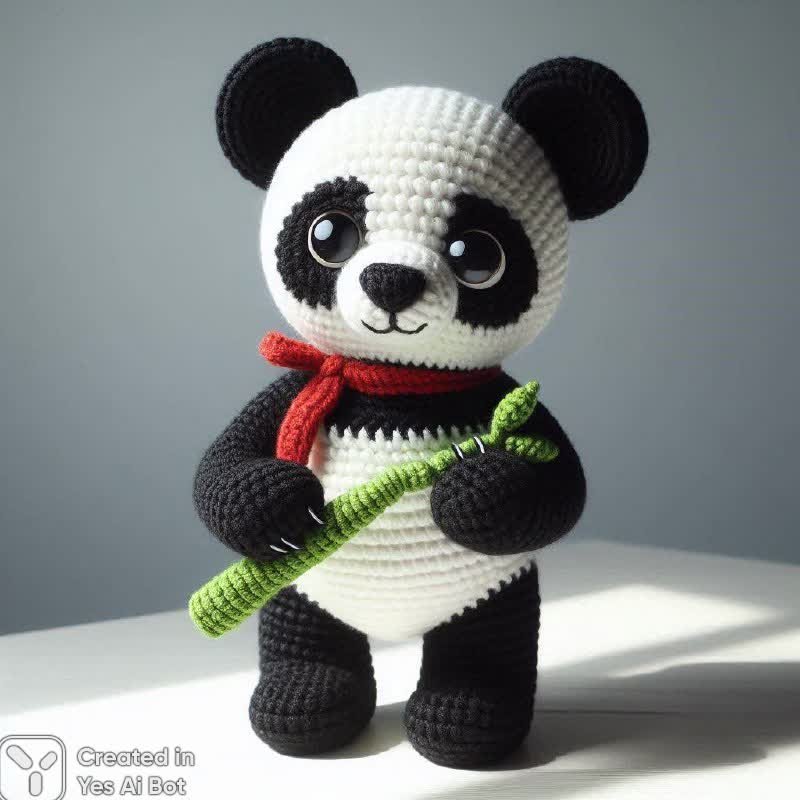 Милый вязаный панда, созданный искусными руками мастера, очаровывает своей простотой и обаянием. Этот пушистый медвежонок выполнен из мягкой чёрной и белой пряжи, что придаёт ему неповторимый шарм и уютную текстуру. Его большие круглые глаза выражают невинность и любопытство, а маленький пуговичный нос добавляет игривости в его образ. Панда грациозно стоит на белоснежной поверхности, словно позируя для портрета, крепко держа в лапках стебель бамбука – символ удачи и процветания в восточной культуре. Вокруг его шеи нежно перевязан маленький красный шарфик, который добавляет яркий акцент к общей черно-белой гамме, делая этого мишку ещё более привлекательным. В целом, этот вязаный панда излучает позитив и радость, вызывая улыбку на лице каждого, кто на него смотрит. Он станет прекрасным украшением интерьера, любимой игрушкой для ребёнка или трогательным подарком для близкого человека, символизирующим дружбу, любовь и хорошее настроение. Его создали с любовью и вниманием к деталям, чтобы подарить частичку тепла и уюта в ваш дом. Этот очаровательный медвежонок станет настоящим талисманом, приносящим удачу и позитивные эмоции в вашу жизнь