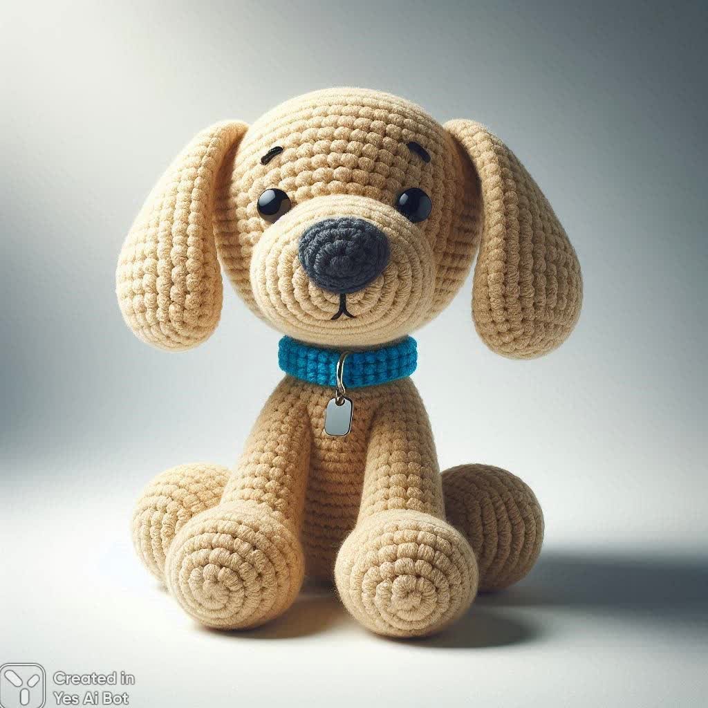 crocheted dog toy made of beige yarn, round body with floppy ears and small black nose, wearing a blue collar with a tiny tag, sitting with head tilted slightly, playful expression, BG is plain white.