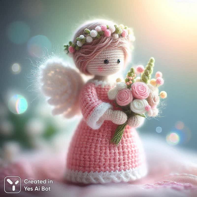 Милый ангел с цветами: нежный дизайн амигуруми в пастельных тонах - Картинка, сгенерированная нейросетью Dalle