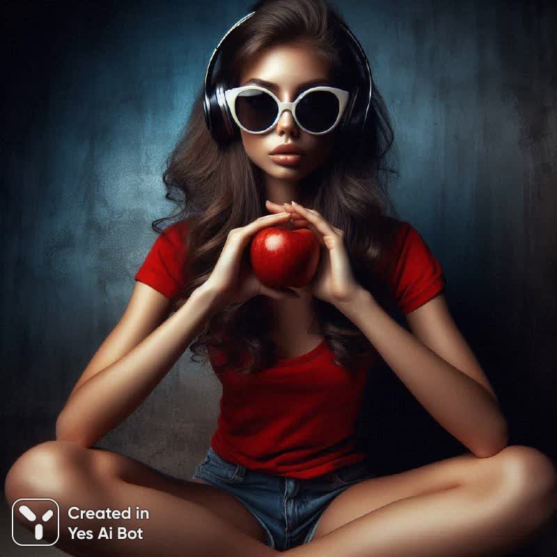 Молодая женщина, излучающая энергию и стиль, запечатлена на профессиональном снимке. Она удобно уселась на землю, скрестив ноги, в яркой красной футболке, подчеркивающей ее индивидуальность. На ее ушах покоятся элегантные черные наушники, намекающие на любовь к музыке. Длинные кудрявые волосы обрамляют лицо, а большие белые солнцезащитные очки с золотой оправой добавляют образу дерзости и загадочности. В руках она нежно держит красное яблоко, словно символ свежести и жизненной силы. Фон снимка выполнен в темно-синих тонах с эффектной грубой текстурой, создающей контраст и глубину. Общее настроение фотографии – игривое и смелое, отражающее современный взгляд на красоту и самовыражение. Кадр идеально передает атмосферу творческой свободы и музыкальной страсти, заставляя зрителя почувствовать динамику момента и прикоснуться к миру молодости и вдохновения. Яркие цвета, необычная поза и детальная проработка создают запоминающийся образ, который вызывает положительные эмоции и желание узнать больше об этой харизматичной девушке. Фотография излучает уверенность, позитив и неповторимый стиль