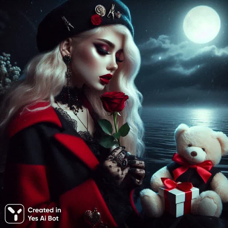 Загадочная красота в объятиях ночи: портрет элегантной блондинки в готическом стиле, словно сошедшей с полотна старинного мастера. Черно-красное пальто подчеркивает ее аристократическую выдержанность, а забавные клипсы на ушах добавляют образу нотку игривости и индивидуальности. На голове – черная шапочка, а в руках она нежно держит алую розу и небольшой подарочный ларец, словно хранящий тайну чувств. Рядом с ней – белоснежный плюшевый мишка, символ невинности и уюта, контрастирующий с мрачной романтикой происходящего. Фон картины – темное море, озаренное лунным светом, создающее атмосферу таинственности и меланхолии. Лицо девушки выражает глубокие эмоции – смесь тоски, надежды и легкой грусти, заставляя зрителя задуматься о ее истории. Яркие алые губы добавляют образу чувственности и страстности. Студийная фотография выполнена с использованием ретро-пленки, что придает ей винтажный шарм и неповторимую теплоту. В сюжете прослеживаются элементы абстрактного сюрреализма, создающие ощущение нереальности и волшебства. Эта работа – настоящий гимн романтике и красоте, запечатленный в моменте скользящего времени, где прошлое встречается с настоящим, а мечта переплетается с реальностью. Композиция вызывает чувство умиротворения и легкой грусти, словно приглашая зрителя окунуться в мир грез и фантазий