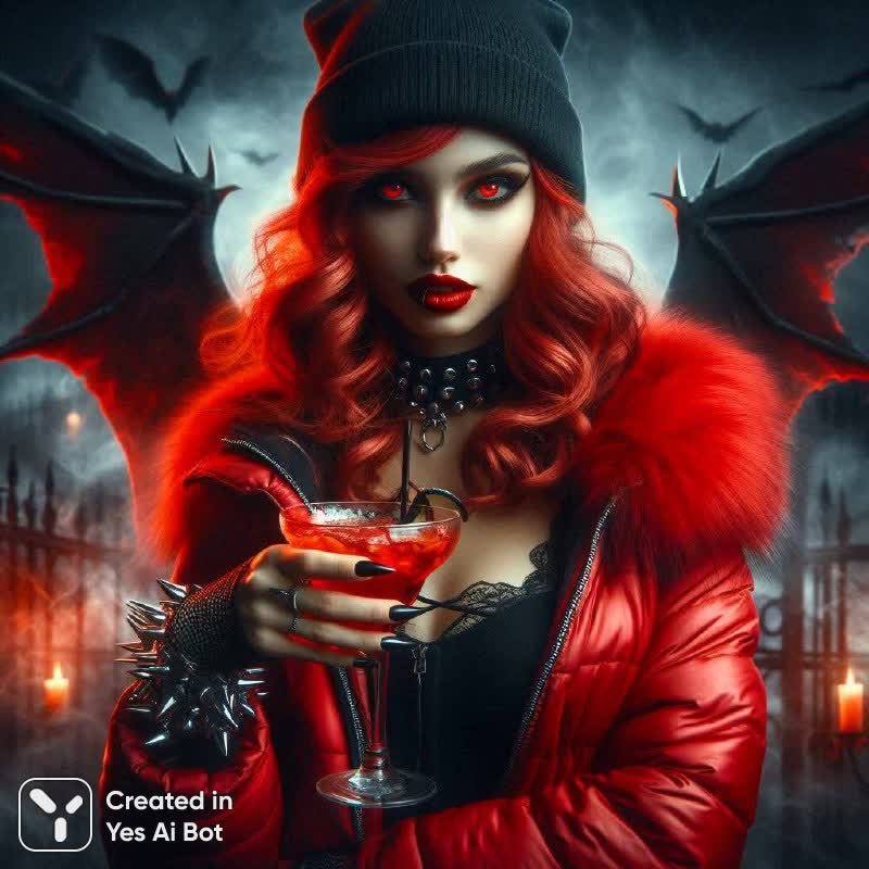 Завораживающий портрет роковой красавицы вампирши, сотканный из ночного мрака и опасной элегантности. В центре внимания – молодая женщина с огненно-рыжими волосами, воплощающая собой хищную грацию и смертельную привлекательность. Её облик дополняет стильный чёрно-красный пуховик, подчеркивающий дерзкий характер, а металлические браслеты и строгий чокер добавляют образу нотку бунтарства и загадочности. На голове – вязаная шапка с заострёнными ушками, намекающая на её сверхъестественную сущность, а яркие алые губы обещают страсть и соблазнение. В руке она держит пылающий красный коктейль, словно символ внутреннего огня и неутолимой жажды. Фоном для этой впечатляющей картины служит туманный ночной город, окутанный мраком и тайнами. Атмосфера тревоги и предчувствия усиливается присутствием чёрного демонического кота, грациозно сидящего у её ног – верного спутника и символа потусторонних сил. За спиной вампирши раскрыты огромные демонические крылья, свидетельствующие о её могуществе и связи с тёмными сферами. Это не просто фотография – это захватывающая история, рассказанная языком света и тени, соблазна и опасности, красоты и тьмы, заставляющая зрителя затаить дыхание и погрузиться в мир сверхъестественного. Кажется, что она вот-вот поведает секрет вечной жизни, но стоит ли доверять её обещаниям?