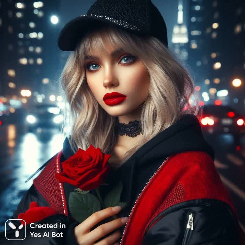 #3 a professional photo cityscape at night. a blonde with bangs combed up wearing a black and red down jacket, accessorized with a baseball cap and choker, bright red lipstick and emotional face, holding a scarlet rose and a plush cat against a darkened background. grunge melody #role_real