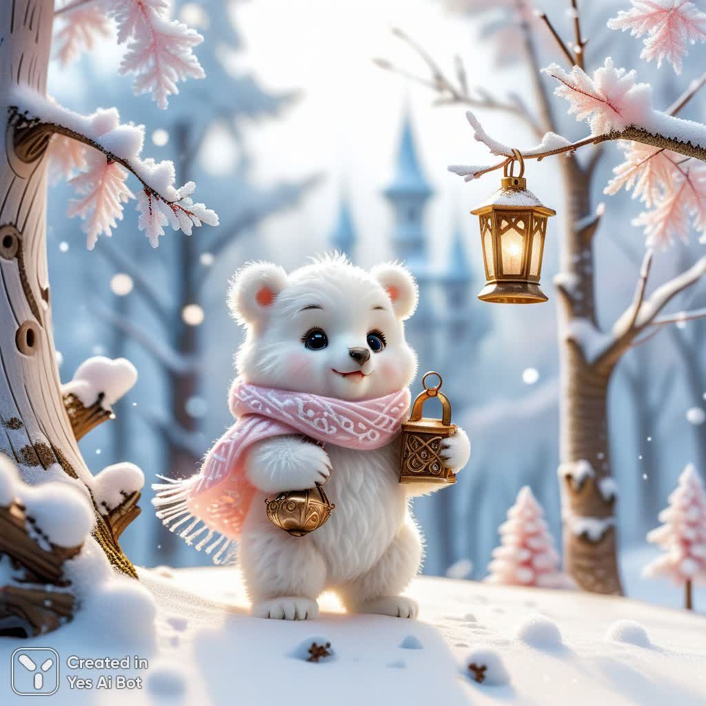 Нежная иллюстрация в стиле фэнтези и сказки представляет собой очаровательного маленького белого медвежонка с пушистой шерстью. Он изображен на фоне чистого белого полотна, создающего эффект воздушности и невесомости. Медвежонок умильно улыбается, а вокруг его шеи нежно-розовый шарфик добавляет образу тепла и уюта. В своей лапке он бережно держит фонарик, освещающий путь в сказочном лесу. Взгляд медвежонка направлен на мудрую сову, восседающую на ветви дерева. Легкие снежинки, падающие с небес, создают атмосферу зимней волшебства и подчеркивают хрупкость момента. Иллюстрация выполнена в технике миниатюры, с использованием тончайшего филигранного узора, напоминающего стиль Диснея. Мягкие пастельные тона и деликатные детали добавляют картине сказочности и нежности. Вся композиция пронизана атмосферой волшебства, тепла и уюта, перенося зрителя в мир грез и фантазий. Белый фон подчеркивает чистоту и невинность образа, а снег и мороз создают ощущение зимней сказки. Иллюстрация идеально подойдет для оформления детских книг, открыток или других изделий, посвященных миру волшебства и чудес. Она излучает позитив, радость и создает атмосферу добра и тепла в душе каждого зрителя