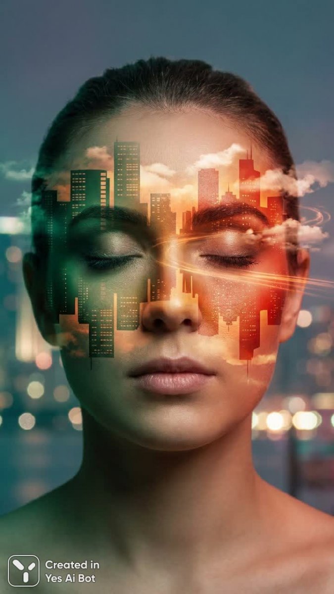 Градиентный портрет с городским пейзажем и сюрреалистичным настроением - Генерация в нейросети NanoBanana