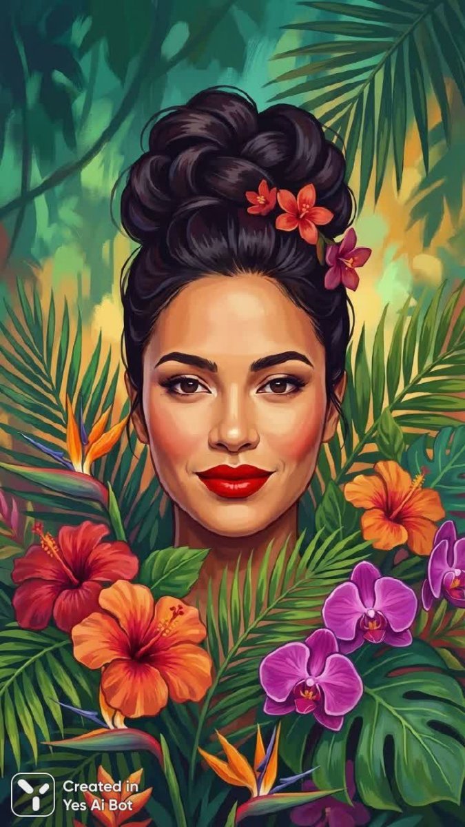 Изысканный портрет, сотканный из цифровых красок, представляет собой завораживающую композицию, где женское лицо становится центром внимания, обрамлённое пышной тропической зеленью и экзотическими цветами. Мягкий свет окутывает образ, подчеркивая нежность черт и загадочность взгляда. Волосы, аккуратно уложенные в элегантный высокий пучок, добавляют портрету аристократичности и изысканности. Яркая, насыщенная помада оттенка бордового притягивает взгляд, придавая изображению чувственности и выразительности. Вся картина пронизана атмосферой тропического рая, где красота природы гармонично переплетается с утончённостью женского образа. Использование ярких цветов и тонких деталей создаёт ощущение реальности и приковывает внимание зрителя к каждой мелочи. Портрет излучает спокойствие и уверенность, отражая внутреннюю силу и независимость женщины. Это произведение искусства – не просто изображение лица, а глубокое исследование красоты, гармонии и связи человека с окружающим миром. Работа выполнена в современной манере цифрового искусства, что добавляет ей оригинальности и уникальности. Каждое растение, каждый цветок, каждая линия на лице тщательно проработаны, создавая единую цельную картину, которая вызывает восхищение своей красотой и мастерством исполнения. Это произведение станет украшением любого интерьера и подарит своим владельцам ощущение умиротворения и гармонии с природой