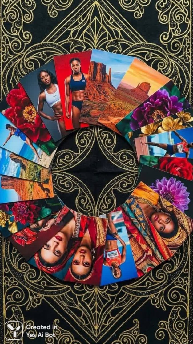 collage of photographs arranged in circular shape, background black with gold pattern, vibrant colors convey beauty and strength.