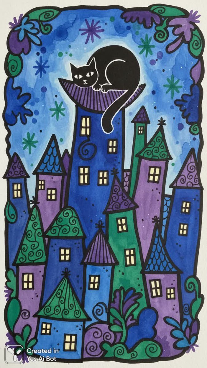 ink drawing, illustration portraying an adorable cityscape at night, simple children's art style in the vein of Matisse, incorporating blue, purple, and green hues while a cat rests atop a roof.