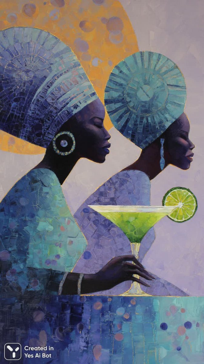 Изящный бокал мартини с освежающей лаймовой долькой на краю, словно приглашение к элегантному вечеру. В центре внимания – две африканские женщины, облачённые в яркие традиционные головные уборы, их взгляды встречаются в символическом диалоге культур и наследия. Фон украшает динамичный диагональный узор, создающий мягкий градиентный эффект, добавляя глубины и визуального интереса композиции. Рассыпанные по всему фону круги придают изображению лёгкость и эстетическую привлекательность, словно мерцающие звёзды в ночном небе. Вся картина выдержана в современном минималистическом стиле, с использованием нежных пастельных тонов, которые создают атмосферу спокойствия, изысканности и гармонии. Это визуальное воплощение красоты, культурного разнообразия и современного дизайна, сочетающее в себе элементы традиционного африканского искусства и современной эстетики. Кажется, что каждая деталь продумана до мелочей, чтобы создать запоминающийся образ, который вызывает чувство восхищения и вдохновения. Изображение передаёт ощущение утончённости, элегантности и радости жизни, приглашая зрителя погрузиться в мир красоты и гармонии