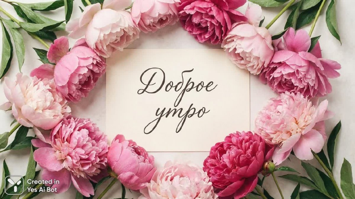Красивое пожелание доброго утра на русском языке оформленное рамкой из розовых пионов на светлом фоне, эффектная композиция, мягкое освещение.
