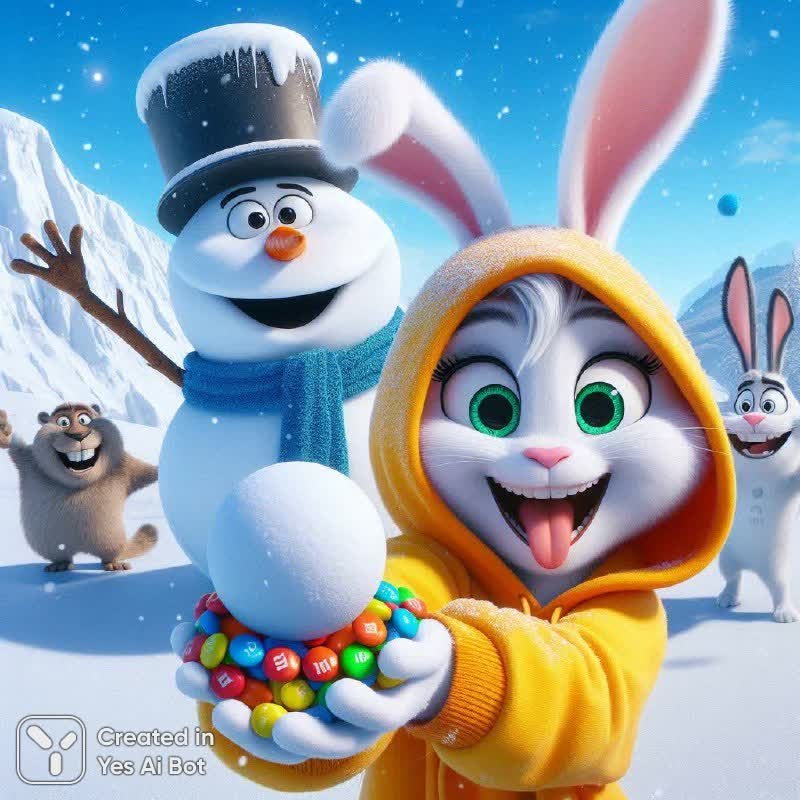 Заснеженная феерия: игривое противостояние кролика и снежного гиганта. Фотография, запечатлённая на плёнке, передаёт атмосферу зимнего безудержного веселья. В центре внимания – очаровательный белый кролик в яркой неоновой толстовке с капюшоном, украшенным принтом M M's, который весело бросает снежок прямо в объектив камеры. Рядом возвышается величественный снеговик с ведром на голове, словно сторожевой ангел зимней сказки. Вокруг царит пушистый пейзаж из сугробов и заснеженных гор, где играют солнечные зайчики и тени, создавая ощущение волшебства. На заднем плане мелькают милые снеговики в виде эмодзи, напоминающие персонажей Pixar или Disney. Детали кролика добавляют образу дерзости: длинные ушки, чокер с шипами, кожаные ремни с клёпкой и упряжка создают динамичный контраст с невинностью зимней забавы. Вся композиция пронизана солнечным светом и энергией движения, передавая ощущение радости, беззаботности и искреннего счастья от общения с природой и друг с другом. Этот снимок – настоящий гимн зиме, наполненный яркими красками, задорными персонажами и незабываемыми моментами. Это мгновение зимней сказки, которое хочется сохранить навсегда