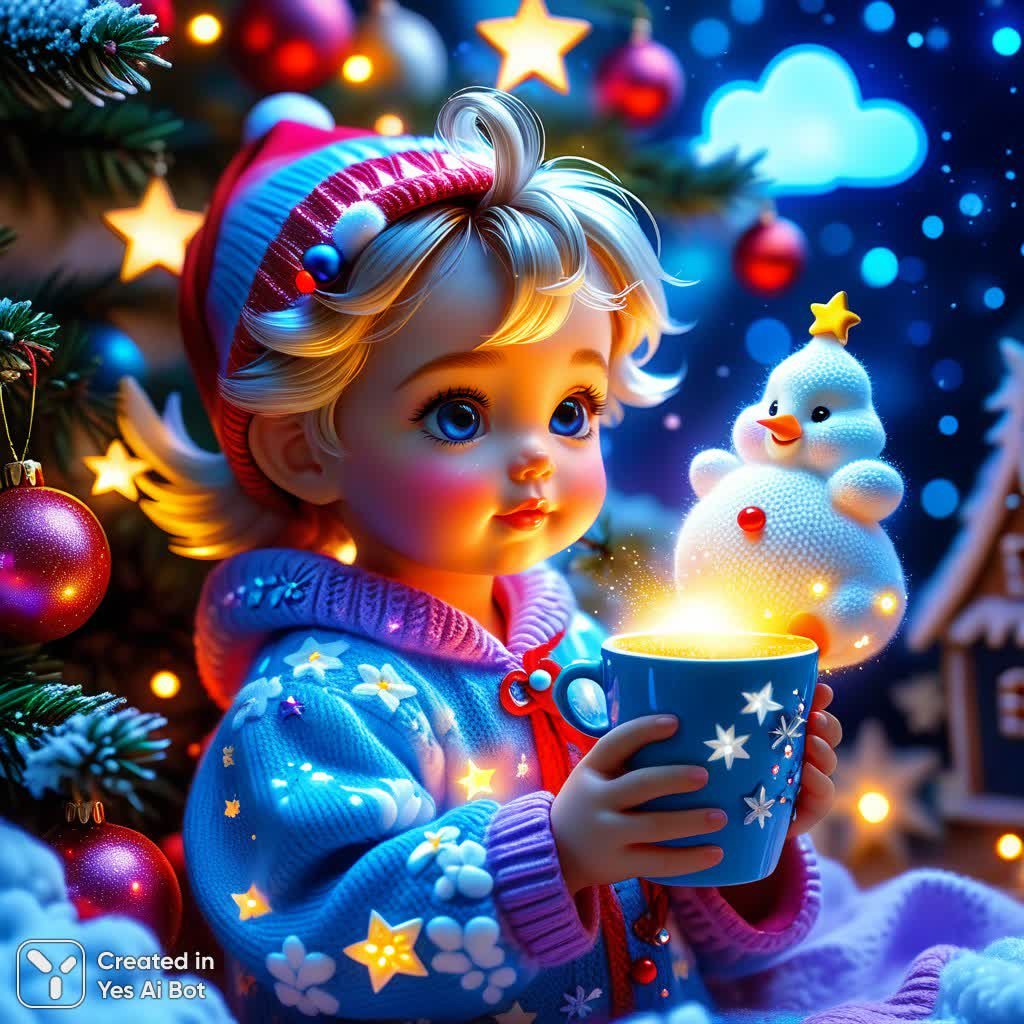 рисунок барельеф из пушистых облаков, новогодняя елочка с игрушками , звезды, цветочки, еловые ветки, елочные шишки, милый cute baby bimbo микро Аксолотльэльф пижаме с принтом вишни, держит в руке чашку смотрит вверх, выпуклые детали, вязанное искусство, неоновое освещение, лиловый голубой, подсветка изнутри, блеск, искры, глиттер, фентази, волшебно, дигитал,сказка, фентези, красиво, высокое разрешение, 5D эффект красок, высокая детализация в стиле художника Марины Федотовой