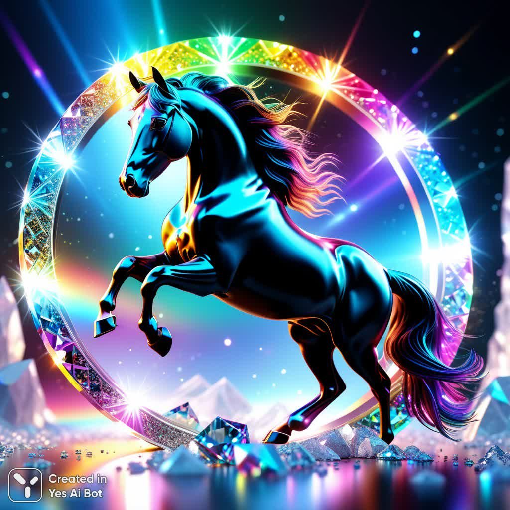 цифровое искусство подчеркивает, что вся высота выполнена на кристальном диске. изумительный шедевральный дизайн. трехмерный профиль. Эйфория. хаос бриллиантов, сияет изумительная сложная лошадка с аурой алмазная огоньки , переливающееся в голографическом неоновом свете. Красиво энергия динамика релакс шедевр грани радужные всполохи