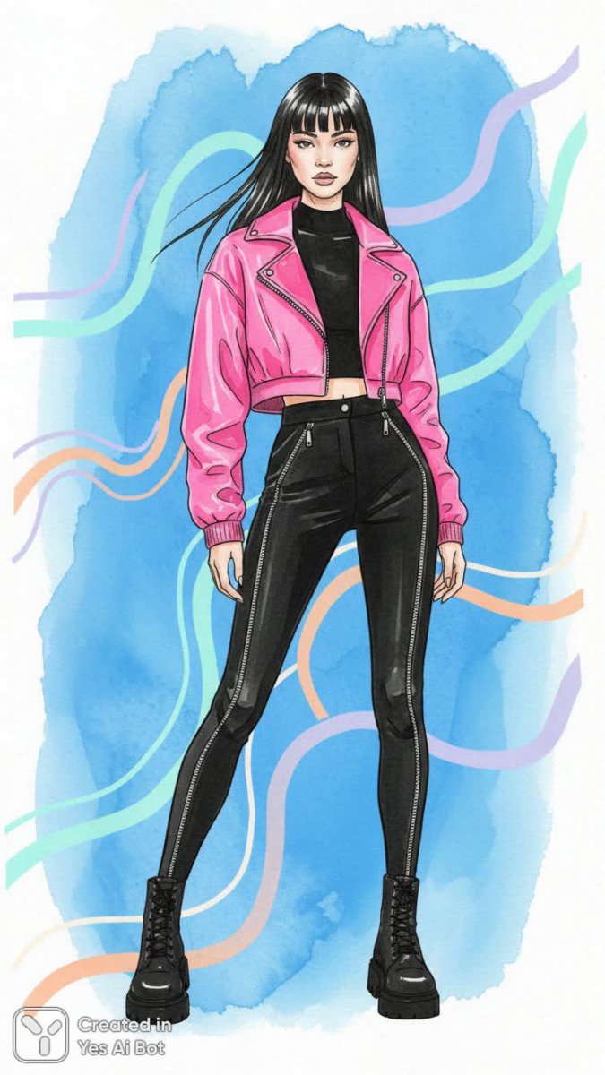 Яркая и дерзкая иллюстрация в технике туши передает энергию современной моды. На фоне электрического синего цвета запечатлена стильная модель, демонстрирующая актуальный образ. Высоко посаженные черные кожаные брюки с серебряными молниями подчеркивают фигуру, а короткий неоново-розовый жакет добавляет акцент в ансамбль. Массивные черные ботинки завершают смелый и запоминающийся лук. Длинные прямые темные волосы контрастируют с насыщенным цветовым решением фона и одежды, создавая динамичный визуальный эффект. Рисунок отличается четкостью линий и выразительностью деталей, что позволяет рассмотреть каждый элемент наряда и передать настроение уверенности и индивидуальности. Эта работа идеально подойдет для обложки модного журнала или рекламной кампании, отражая последние тенденции в индустрии стиля и красоты. Использование неоновых оттенков придает изображению футуристический шарм и привлекает внимание зрителя. Художественное решение позволяет создать запоминающийся образ современной женщины, смелой и готовой к экспериментам с модой. Композиция тщательно продумана, чтобы подчеркнуть силуэт модели и выделить ключевые элементы ее наряда