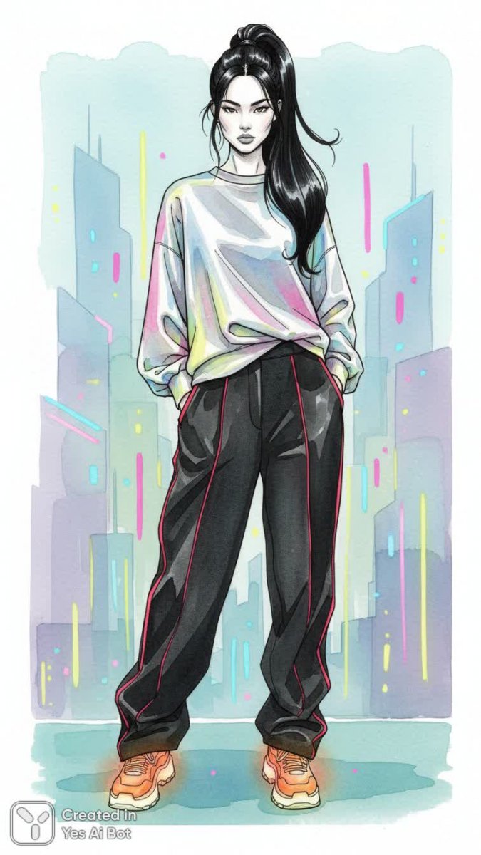 Современная мода в ярких неоновых тонах воплощена в этой эффектной иллюстрации. Изящная модель демонстрирует стильный образ на фоне динамичной городской атмосферы. Ее длинные темные волосы собраны в гладкий высокий хвост, подчеркивая изящество силуэта и создавая ощущение энергии движения. Образ дополнен серебристым укороченным топом с длинными рукавами, отражающим свет и притягивающим взгляд. Высокая черная брюка палаццо создает контраст и добавляет образу элегантности и уверенности. Завершают лук массивные неоново-оранжевые кроссовки – акцентный элемент, который подчеркивает современность и динамичность стиля. Рисунок выполнен в технике туши, что придает изображению графичности и выразительности. Игра света и тени, яркие цветовые решения и детализированная проработка создают неповторимую атмосферу уличной моды и подчеркивают индивидуальность модели. Это визуальное воплощение трендов, сочетающее в себе комфорт и изысканность, идеально отражающее дух современного мегаполиса и его жителей. Иллюстрация передает ощущение свободы самовыражения через моду, демонстрируя смелое сочетание текстур и цветов