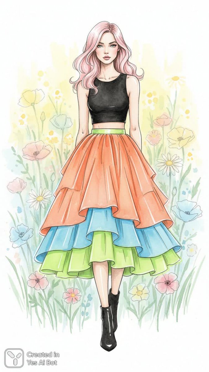 illustration, ink drawing, fashion model, neon colors posing in layered skirts with neon stripes, paired with a cropped black tank top, wearing high-heeled ankle boots, pastel pink hair styled in loose waves, flower field in background.