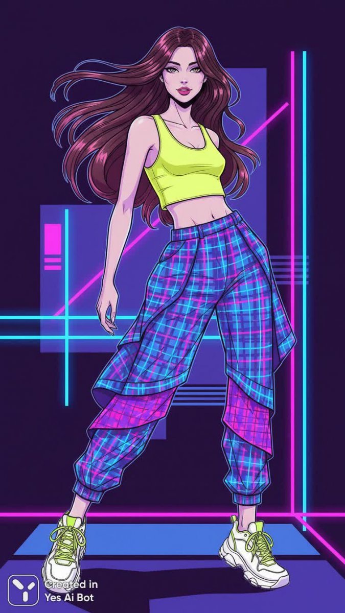 Яркая иллюстрация в технике туши представляет собой стильный образ современной модели. В центре внимания – дерзкий наряд: неоново-желтый кроп-топ и широкие клетчатые брюки создают эффектный контраст, подчеркнутый массивными белыми кедами. Длинные каштановые волосы, свободно ниспадающие на плечи, добавляют легкости и игривости всему ансамблю. Цветовая палитра выполнена в насыщенных неоновых тонах, что придает изображению динамичность и футуристический шарм. Работа отличается четкостью линий и вниманием к деталям, передавая не только внешнюю привлекательность модели, но и ее уверенность и современный взгляд на моду. Этот образ – воплощение смелости, индивидуальности и трендового сочетания классики и авангарда. Иллюстрация идеально подойдет для модных журналов, рекламных кампаний или просто как яркий элемент декора, способный привлечь внимание своей необычностью и энергией. Она демонстрирует гармоничное сочетание стильной одежды, акцентного макияжа и уверенной позы модели, создавая запоминающийся визуальный образ. Ощущение движения и энергии передается благодаря динамичной композиции и ярким неоновым цветам, которые словно оживляют изображение