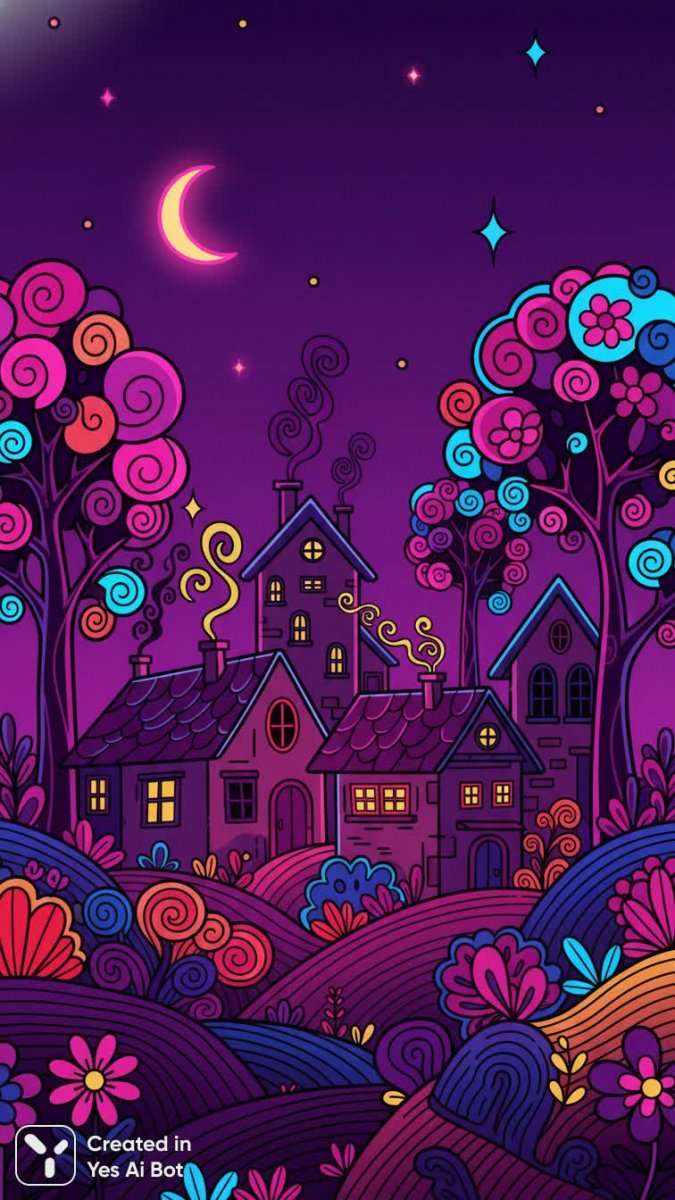 Сказочные домики под фиолетовым небом ночной иллюстрации - Пример изображения из нейросети NanoBanana