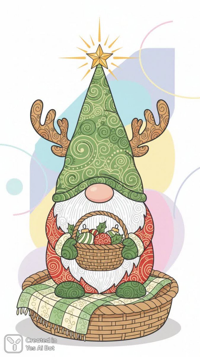 zentangle, christmas gnome figurine standing upright, long pointed green hat with a gold star, soft fuzzy material, reindeer antlers on either side, woven basket setting.