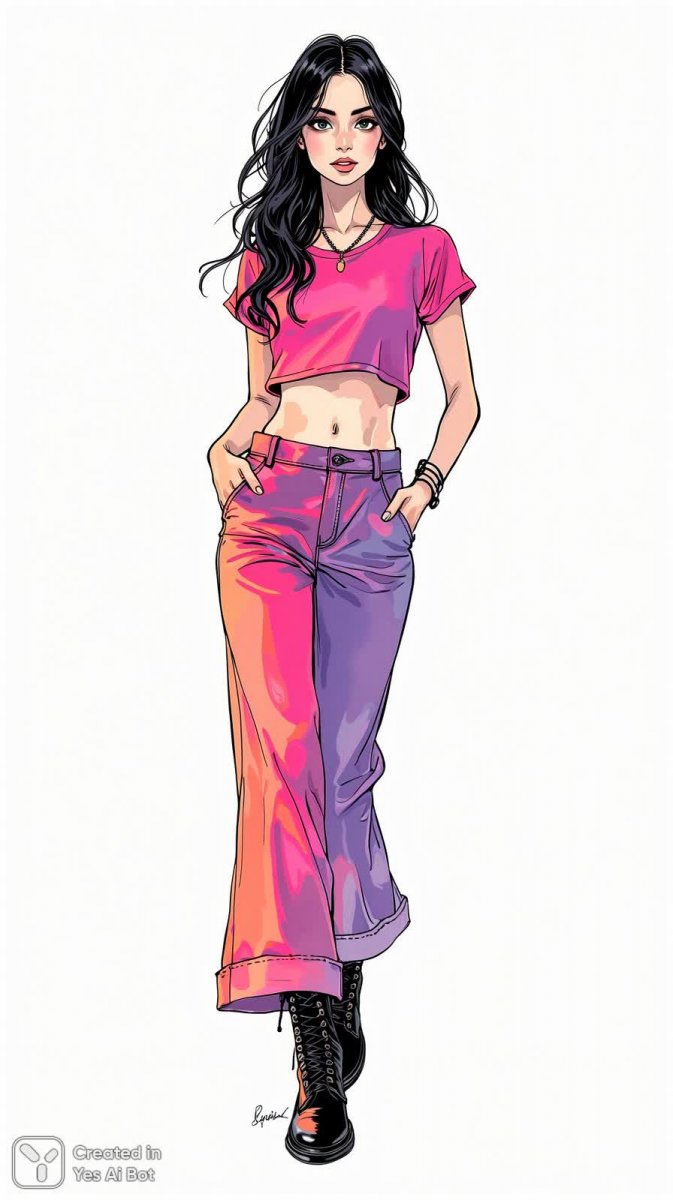 Яркая и дерзкая иллюстрация модной модели в студийной обстановке завораживает своей динамикой и смелым сочетанием цветов. На белоснежном фоне выделяется стильный образ: неоновые акценты подчеркивают современный взгляд на моду, а насыщенный розовый топ создает эффектный контраст с широкими брюками. Дополняет ансамбль пара черных ботинок в стиле милитари – смелое и неожиданное решение, добавляющее образу бунтарский дух. Длинные темные волосы, уложенные в свободные волны, придают модели непринужденность и элегантность. Изящный рисунок тушью демонстрирует мастерство художника, передавая каждую деталь – от текстуры ткани до легкости позы. Это не просто иллюстрация, это визуальный манифест уверенности и индивидуальности, отражающий последние тенденции в мире моды. Кажется, что модель застыла в движении, излучая энергию и привлекательность. Неоновые блики играют на поверхности кожи, создавая ощущение объема и глубины. Этот образ идеально подойдет для обложки модного журнала или рекламной кампании, стремящейся привлечь внимание молодой аудитории, ценящей смелые решения и оригинальный стиль. Яркие краски и динамичная поза делают эту иллюстрацию запоминающейся и привлекающей взгляд, а стильная одежда подчеркивает индивидуальность модели