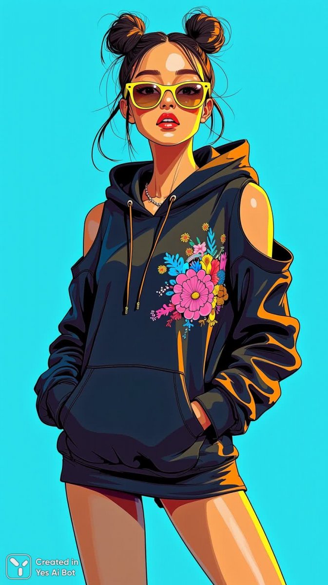 Яркая иллюстрация в технике чернильной живописи представляет собой стильный образ современной модной модели. На фоне насыщенного синего цвета модель эффектно выделяется благодаря неоновой палитре и тщательно подобранному гардеробу. Верхний наряд – черный худи с оригинальным графическим дизайном, расположенным с левой стороны; рукава смело укорочены прямо под плечами, создавая дерзкий акцент. Материал худи имеет выразительный блеск, а высокий воротник добавляет образу загадочности и элегантности. Завершает образ пара желтых солнцезащитных очков, которые подчеркивают индивидуальность и добавляют нотку бунтарства в этот ультрасовременный лук. Композиция выполнена с акцентом на детали, что позволяет оценить мастерство художника и выразительность модели. Яркие цвета и смелое сочетание текстур создают динамичный визуальный эффект, привлекающий внимание и оставляющий неизгладимое впечатление. Это не просто иллюстрация, а целая история, рассказанная через моду и искусство. Изображение излучает уверенность, современность и креативность, идеально подходящее для рекламных кампаний или обложек модных журналов. В целом, работа демонстрирует высочайший уровень мастерства и художественное видение, представляя собой пример современного визуального искусства