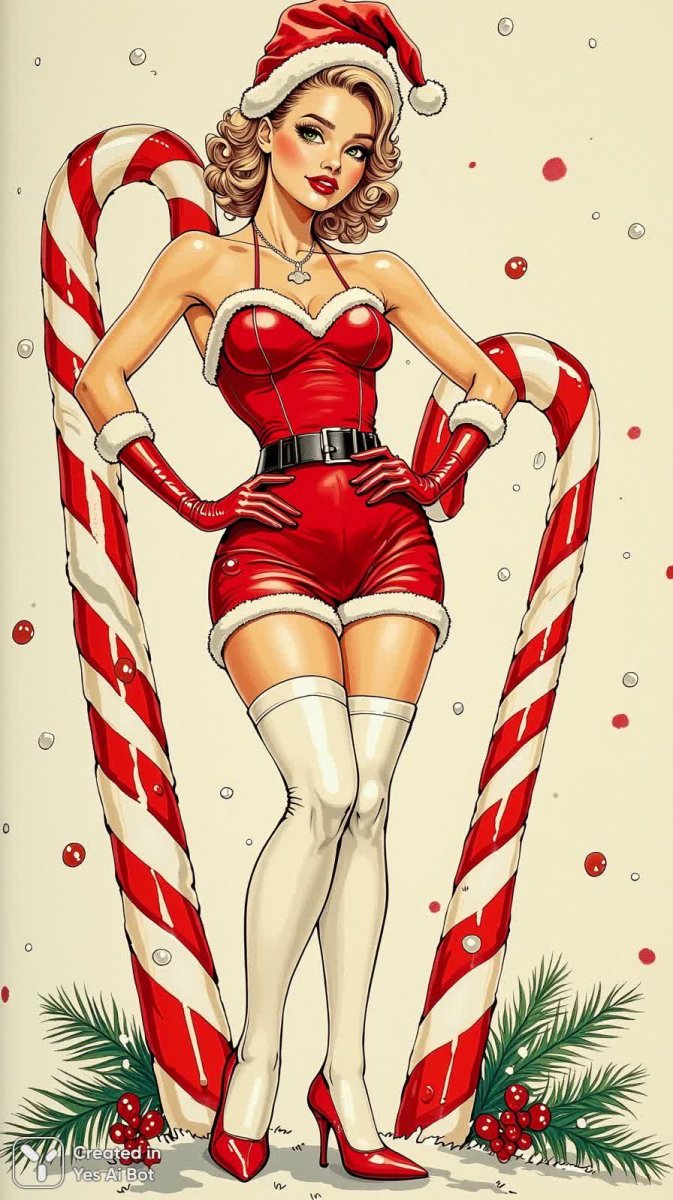illustration, ink drawing, fashion model, neon colors, standing with hands on hips in fitted red velvet santa claus costume, thigh-high white socks, red lipstick, knee-length satin gloves, voluminous curls styled high, surrounded by oversized candy canes and holiday decorations, vibrant pin-up vibe.
