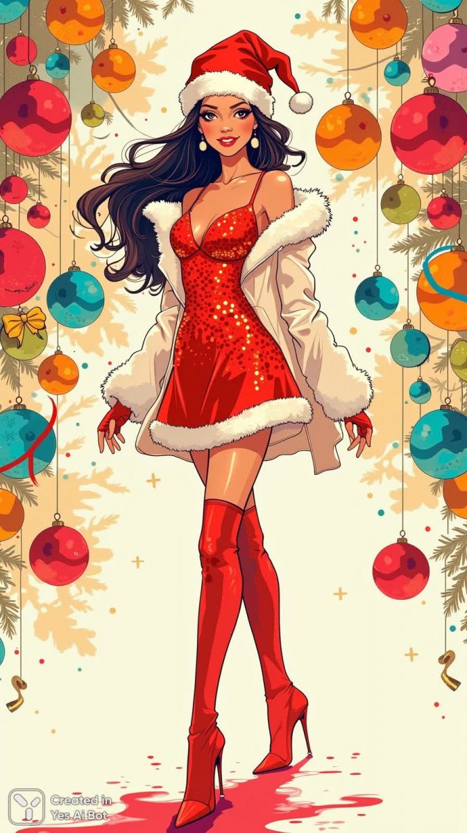 illustration, ink drawing, fashion model, neon colors, twirling in sexy santa mini dress with red sequins, white fur collar, matching knee-high stockings, high-heeled boots, showcasing a confident smirk, backdrop of colorful holiday ornaments, festive pin-up atmosphere.