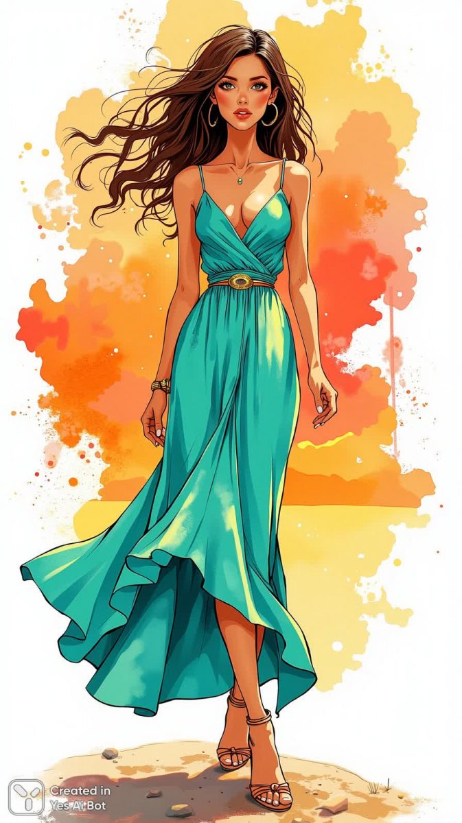 Изысканная иллюстрация в технике туши переносит нас в мир высокой моды и мечтательных образов. На фоне закатного неба, окрашенного теплыми оттенками, запечатлена элегантная модель в потрясающем макси-платье цвета морской волны. Асимметричный подол придает платью динамичности, а акцент на талии с помощью стильного металлического пояса подчеркивает изящную фигуру. Тонкие ремешки высоких каблуков дополняют образ, добавляя нотку дерзости и женственности. Пышные кудри обрамляют лицо модели, создавая ощущение легкости и воздушности. Вся композиция пронизана игрой неоновых цветов, которые придают изображению современный и запоминающийся вид. Это не просто иллюстрация – это воплощение шика и фантазии, передающее атмосферу волшебства и вдохновения. Кажется, будто время замерло в этом мгновении красоты и грации, позволяя зрителю окунуться в мир грез и высокой моды. Использование туши придает работе особую глубину и текстуру, а выбранные цвета создают гармоничное сочетание, которое не оставляет равнодушным. Это произведение искусства – настоящий праздник для глаз, способный подарить позитивные эмоции и вдохновить на новые свершения. Контраст между плавными линиями платья и четкими деталями акцентов создает удивительный визуальный эффект