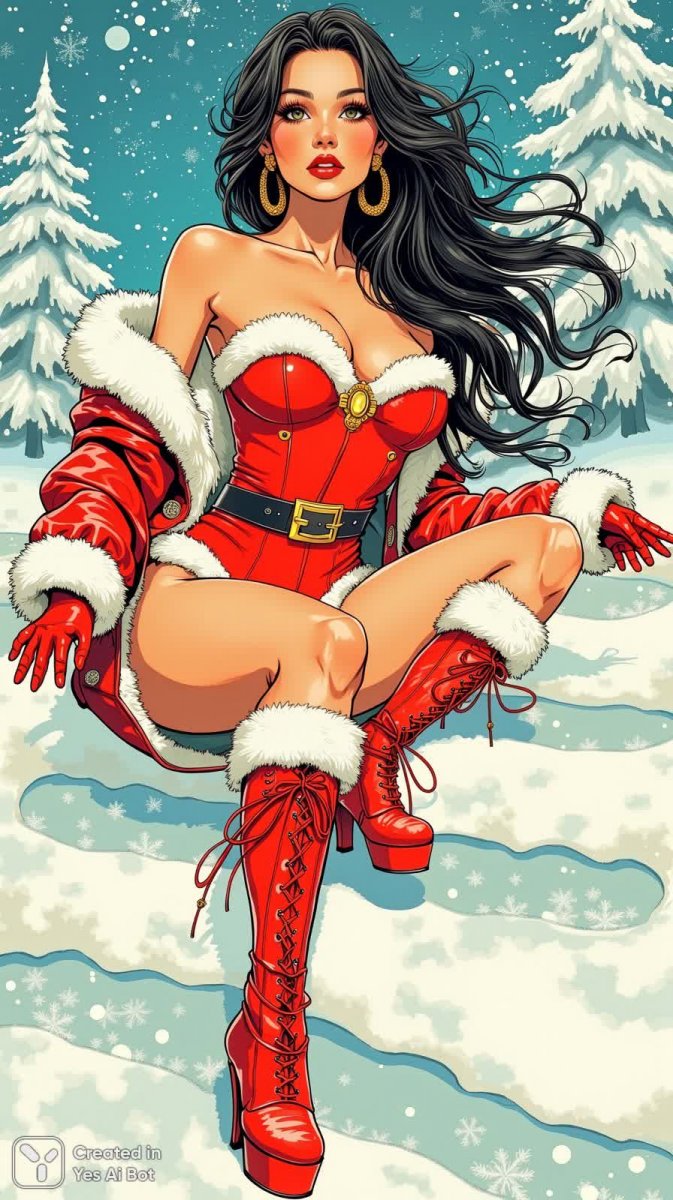illustration, ink drawing, fashion model, neon colors, using dynamic pose in cheeky santa claus bodysuit with luxurious faux fur accents, gold hoop earrings, high platform boots, long dark curls cascading over shoulders, playful smile, set against a sparkling snow landscape, classic pin-up flair.