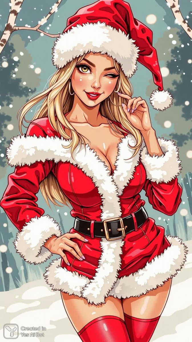 illustration, ink drawing, fashion model, neon colors, posing outdoors in a flirty santa outfit, complete with fluffy trim and a matching hat, wearing thigh-high stockings and vibrant red lipstick, exuding holiday cheer with a wink and playful expression.