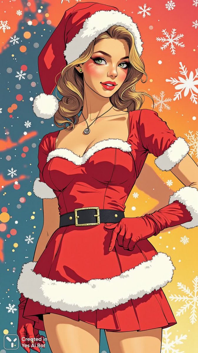 Игривое сочетание эпохи и современности предстает в яркой иллюстрации, выполненной чернилами. На фоне мерцающих огней эффектно позирует изящная модель, облаченная в необычный костюм, вдохновленный образом Санта-Клауса в винтажном стиле. Высокая юбка подчеркивает талию, а прилегающий верх создает силуэт, полный элегантности и шарма. Белый пояс акцентирует внимание на фигуре, а красные перчатки добавляют праздничного настроения. Выразительный взгляд с игривым подмигиванием завершает образ, излучая беззаботную радость и очарование. Неоновые цвета придают изображению футуристический оттенок, создавая контраст между ретро-стилем костюма и современной эстетикой. Это визуальное воплощение праздничного настроения с долей дерзости и оригинальности, где классические мотивы переплетаются с современными трендами в мире моды. Иллюстрация словно приглашает зрителя окунуться в атмосферу волшебства и веселья, сочетая в себе ностальгию по прошлому и предвкушение будущего праздника. Она выделяется своей необычностью и смелостью, предлагая свежий взгляд на традиционный образ Санта-Клауса