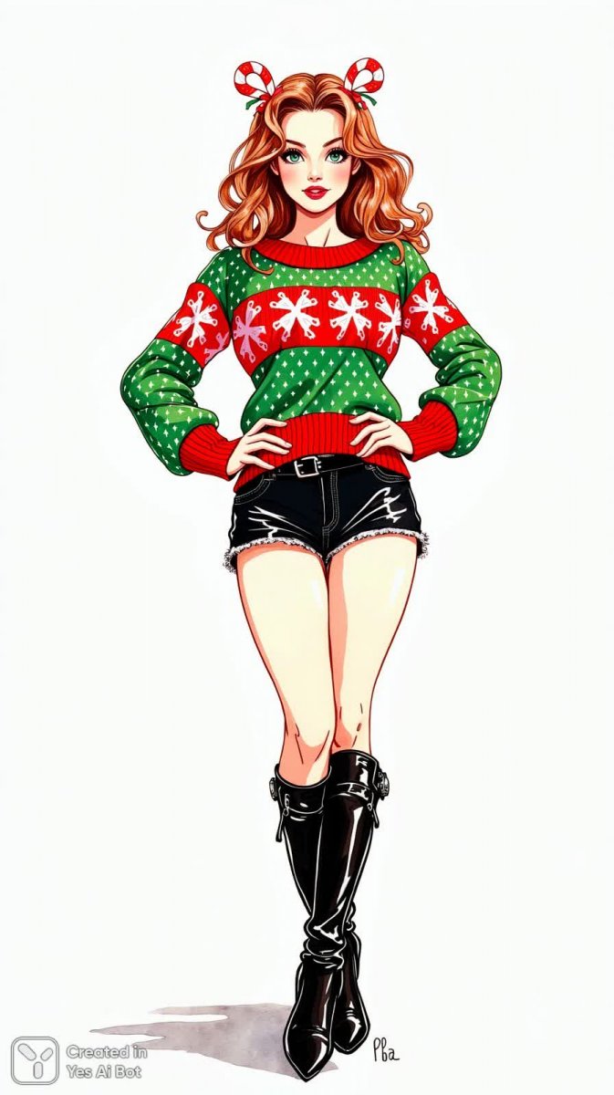 illustration, ink drawing, fashion model, neon colors, standing with hands on hips in a pin-up style red and green christmas sweater, paired with black leather shorts and knee-high black boots, hair in bouncy waves adorned with candy cane hairpins, vibrant holiday atmosphere.