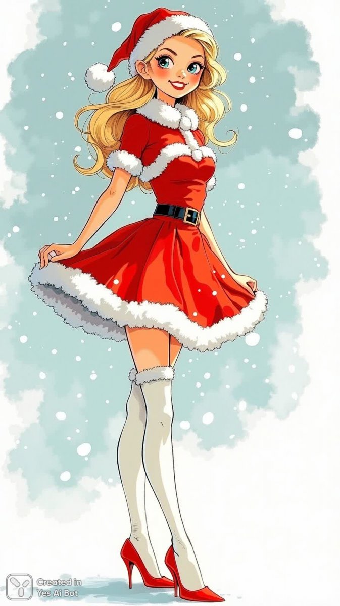 illustration, ink drawing, fashion model, neon colors, posing in festive red and white santa claus outfit with a fitted bodice and flared skirt, wearing white knee-high stockings, high red heels, long blonde hair styled in vintage curls, playful expression against a snowy background, holiday spirit.