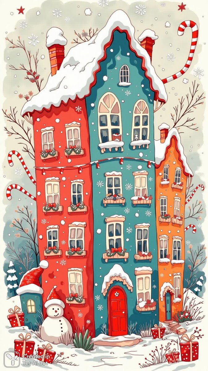 ink drawing, whimsical houses inspired by pin-up art with a festive santa touch, featuring bright colors and playful patterns, surrounded by candy canes and snowflakes, evoking a joyful holiday spirit.