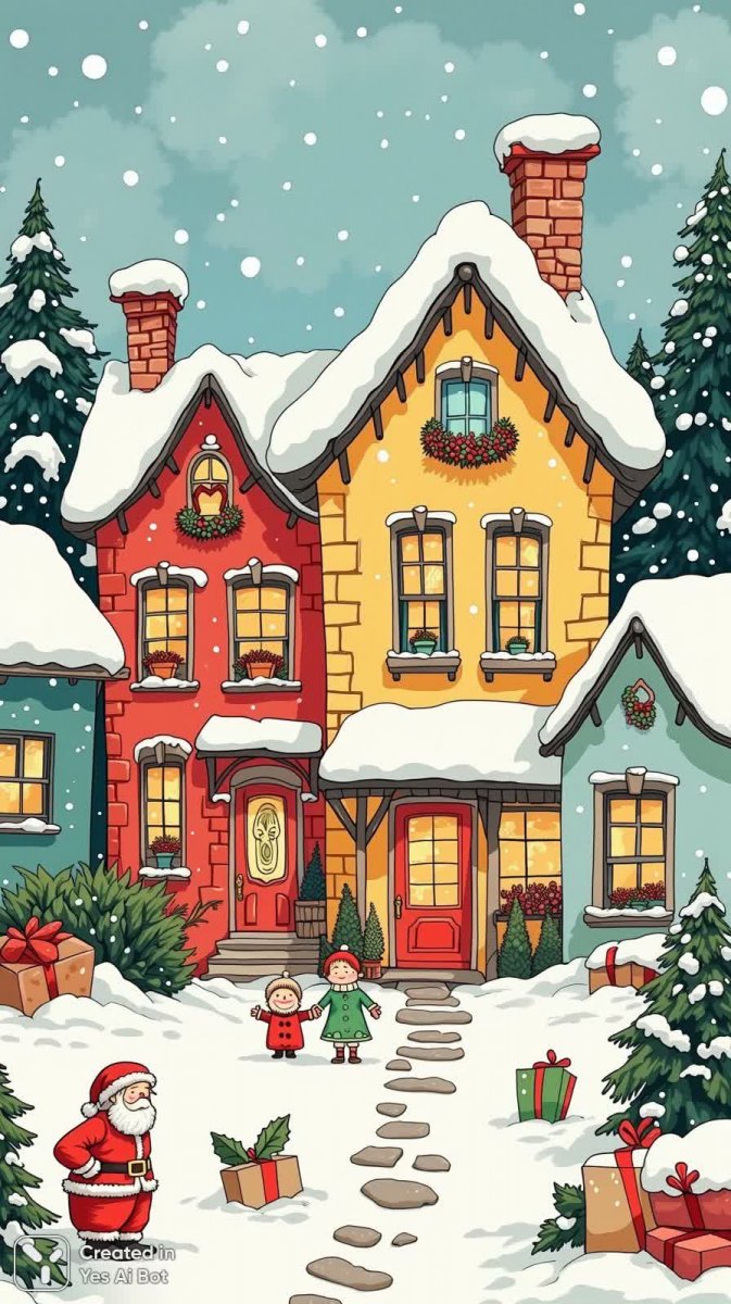 doodling, colorful cartoon houses with adorable pin-up accents and santa claus motifs, set against a cheerful winter backdrop filled with vibrant details and cozy comforts.