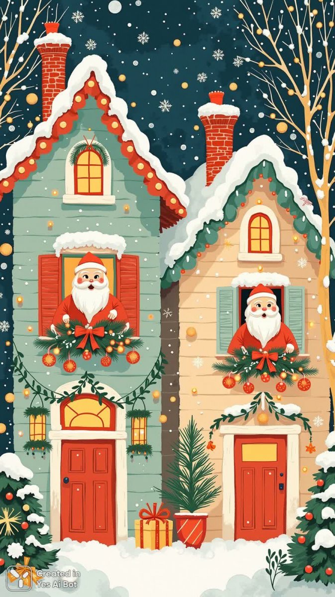 Очаровательная иллюстрация в стиле народного искусства переносит нас в волшебный мир рождественских домов. Нежные пастельные тона создают атмосферу уюта и тепла, а ретро-элементы пин-ап добавляют картине неповторимый шарм и ностальгическую прелесть. Каждый домик, словно сошедший со страниц старинной открытки, украшен гирляндами и мерцающими огоньками, создавая ощущение праздничного чуда. Изящные детали и мастерская роспись передают дух народных традиций и ручной работы, подчеркивая уникальность каждого элемента. Эта иллюстрация – идеальный способ привнести в ваш дом атмосферу зимней сказки, наполненную радостью и предвкушением новогодних чудес. Она станет прекрасным украшением интерьера, вдохновляющим на создание праздничного настроения и дарящего ощущение тепла и уюта даже в самые холодные дни. Изображение излучает доброту и позитив, приглашая нас окунуться в мир волшебства и ощутить атмосферу настоящего рождественского чуда. Это не просто картинка – это частичка зимней сказки, которая согреет душу и подарит радость каждому зрителю. Нежные цвета и стилизованные элементы создают неповторимую визуальную гармонию, делая эту иллюстрацию поистине особенной и запоминающейся. Она словно приглашает нас заглянуть в гости к Санте на его уютные рождественские праздники