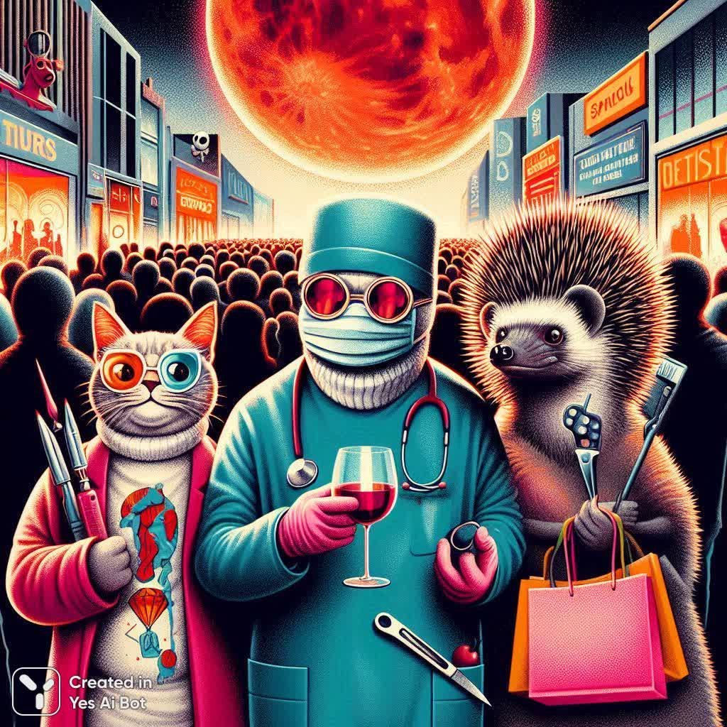 Черная пятница и день отказа от покупок и выдумывания новых слов. Кот-шопоголик, врач-хирург маске и со скальпелем и большой еж стоят с бокалами вина в руках. Позади них огромные очереди у магазины и люди идущие с покупками. Над ними в небе висит красная планета. Фантастика.