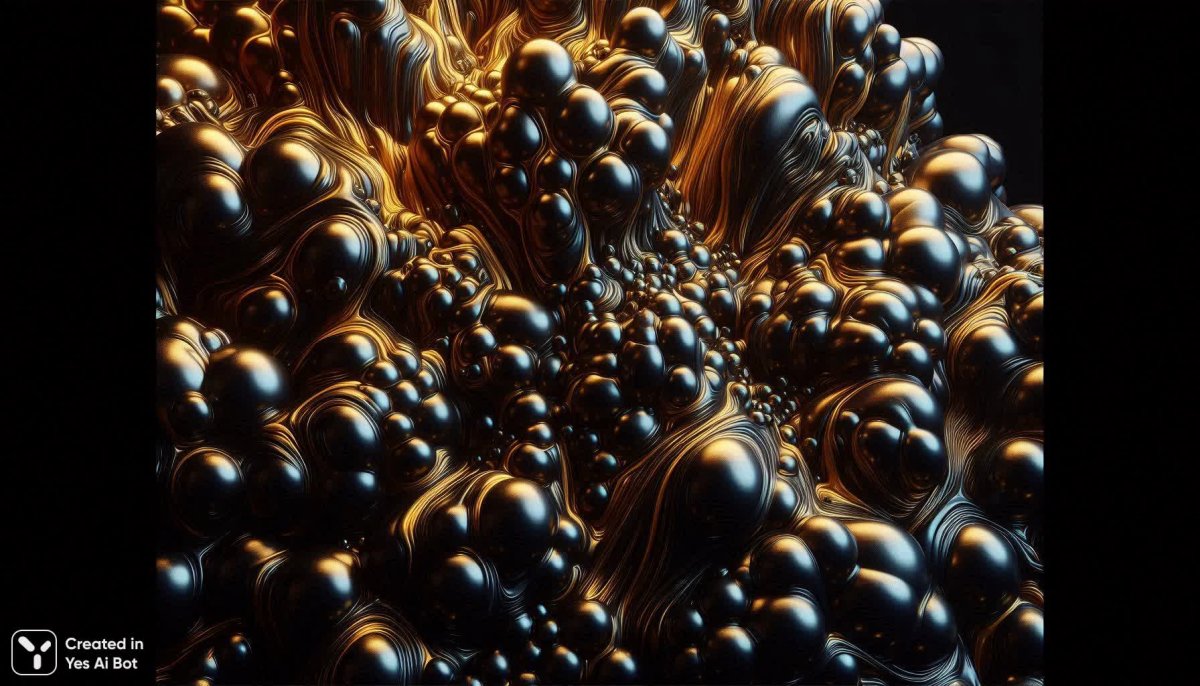 Завораживающий макроснимок сложной органической поверхности, где темные полированные камни погружены в золотистую тягучую жидкость. Изображение поражает детальностью и реалистичностью, демонстрируя замысловатый узор из разноразмерных неправильных камней, создающих ощущение хаотичной, но при этом гармоничной композиции. Жидкость обладает глянцевым блеском с едва заметными отражениями, добавляя глубины и объема изображению. Драматическое освещение подчеркивает текстуру каждого элемента, акцентируя внимание на мельчайших деталях поверхности. Эта работа выполнена в технике макрофотографии и гиперреалистичной рендеринга, с использованием Octane Render для достижения невероятной четкости и детализации в разрешении 8k. Вдохновленная геометрическими натюрмортами из цветных линий, трансформированных в образ фигуры, эта работа представляет собой уникальное сочетание органической текстуры и абстрактной формы, создавая ощущение погружения в мир фантастических материалов и световых эффектов. Каждая деталь проработана до мельчайших подробностей, демонстрируя мастерство исполнения и новаторский подход к визуальному искусству. Это произведение вызывает чувство восхищения сложностью природы и возможностями современного цифрового искусства, приглашая зрителя исследовать его глубины и раскрыть скрытые смыслы