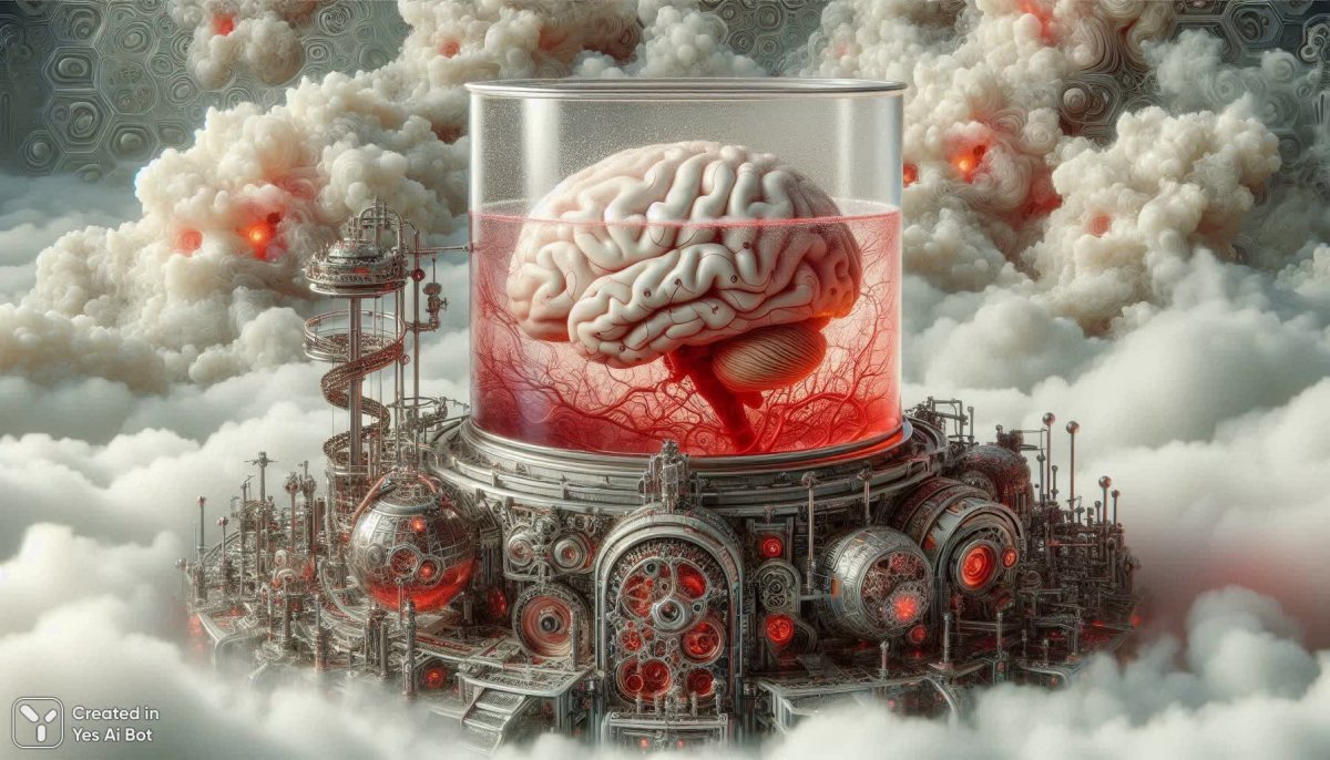 фон клубы тумана фрактал. белый мозг с красными капиллярами желе плавающий в бульоне в большом стеклянном чане с рассолом.агрегат механизм трансформаторы фрактал стимпанк.