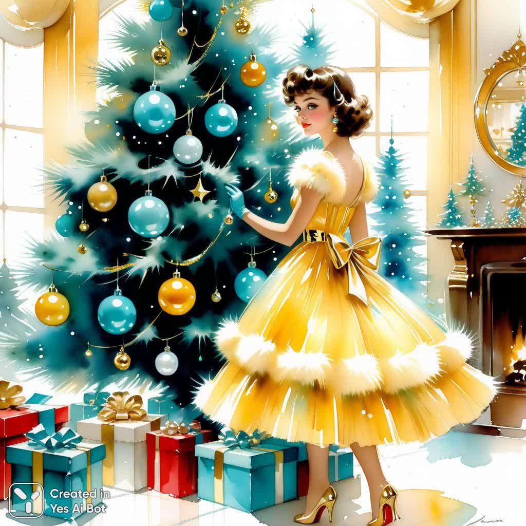 Ностальгическая картина, переносящая в атмосферу пятидесятых годов. На ней изображена девушка в воздушном, пушистом платье, находящаяся в сверкающем новогоднем магазине. Яркая елка украшена блестящими игрушками, создавая ощущение праздничного чуда и беззаботности. Цветовая палитра выполнена в нежных пастельных тонах: выцветший желтый, небесно-голубой и золотой, что добавляет изображению винтажного шарма. Работа выполнена в технике акварели с эффектом влажности и перламутрового сияния, придавая ей особую мягкость и нежность. Стиль картины вдохновлен работами известных художников Хаджиме Сораямы и Харрисона Фишера, сочетая в себе гладкость и футуристичность первого и романтизм и изысканность второго. Это произведение искусства – это настоящий портал в прошлое, наполненный теплом, уютом и духом старой доброй новогодней сказки. Картина излучает светлую радость и вызывает приятные воспоминания о беззаботных временах, когда мир казался ярче и волшебнее. Идеально подойдет для тех, кто ценит ретро-эстетику и мечтает о возвращении в золотую эпоху прошлого, ощущая при этом нежность и легкость акварельных красок