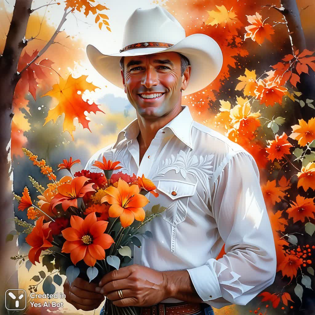 Очаровательный портрет мужчины в белой ковбойской шляпе и прозрачной белой рубашке, излучает тепло и радость. В его руках – пышный букет ярких осенних цветов насыщенных красных и оранжевых оттенков, символизирующих красоту увядающей природы. На заднем плане расстилается богатая палитра осенней листвы, создавая атмосферу умиротворения и гармонии с окружающим миром. Мужчина слегка наклонил голову, придерживая края шляпы пальцами, его рубашка небрежно расстегнута, добавляя образу непринужденности и естественности. Фотореалистичная детализация сочетается с элементами эскиза и точечного рисунка в стиле Ли Богла, а также с акварельной живописью в манере Томаса Шаллера, создавая неповторимый визуальный эффект. Картина передает ощущение тепла, уюта и восхищения красотой осенней природы, запечатлевая момент искренней радости и гармонии с собой и окружающим миром. Этот образ наполнен светом и позитивом, вызывая приятные эмоции и желание насладиться каждым мгновением жизни. В целом, работа представляет собой мастерское сочетание различных художественных техник, создающее яркий и запоминающийся визуальный опыт для зрителя, погружающего его в атмосферу осеннего тепла и очарования