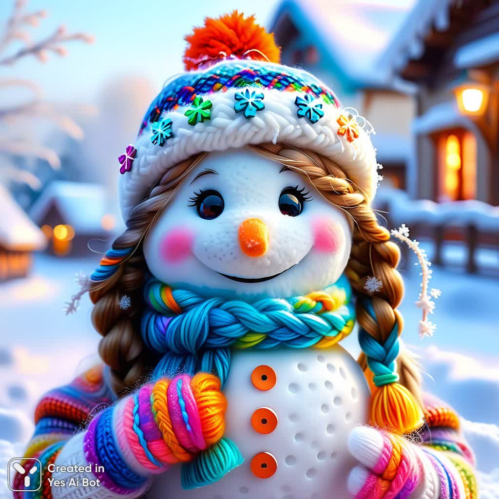 Заснеженный снеговик излучает тепло и радость, запечатленный в момент искреннего смеха. На его голове красуется уютная шапка с отложным козырьком, украшенная густыми косичками из разноцветных нитей, создающих ощущение волшебства и сказки. Поза снеговика слегка повернута, словно он делится секретом или наблюдает за происходящим вокруг. В его рукавице укрывается крошечная девочка, добавляя композиции нотку нежности и заботы. Вокруг царит зимняя атмосфера: пушистые прозрачные снежинки мягко кружатся в воздухе, создавая ощущение легкости и безмятежности. Легкий иней покрывает все вокруг, подчеркивая хрупкость и красоту момента. Все элементы изображения тщательно проработаны с использованием тонких слоев из ворсистого фетра и нитей, что придает работе особую текстуру и объем. Стиль Dotremer Chuvilyaev проявляется в нежной палитре пастельных оттенков, создающих ощущение мягкости и уюта. Использование техники zentagl добавляет изображению динамики и визуального интереса, делая его сложным и привлекательным для взгляда. Эта зимняя сцена - воплощение радости, тепла и волшебства, запечатленное в деталях и выполненное с любовью к искусству. Кажется, что из этой картины веет свежестью морозного воздуха и предвкушением чудес