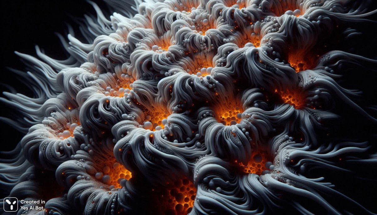 Highly detailed close-up white dark, organic structure resembling a biomechanical hand or alien organism.surface is textured with intricate patterns and cavities filled with glowing orange bioluminescent spheres. Dramatic lighting emphasizing the depth and complexity of the form. The overall aesthetic should be unsettling yet captivating. Macro photography, hyperrealistic rendering, octane render, 8k resolution. Inspired by H.R. Giger's biomechanical art and Zdzisław Beksiński’s organic for