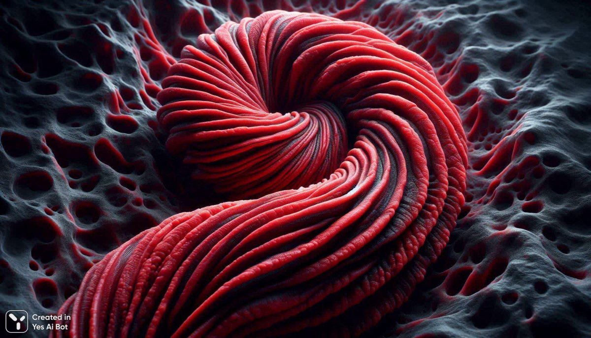 Highly detailed close-up of a vibrant red, undulating organic form resembling a twisted ribbon or alien appendage. The surface is textured with intricate patterns and subtle cracks, giving it a sense of depth and realism. It's embedded in a dark, porous stone structure with numerous small cavities. Dramatic lighting emphasizing the texture and shape, creating an unsettling yet captivating atmosphere. Macro photography, hyperrealistic rendering, octane render, 8k resolution. Inspired by H.R. Giger’s biomechanical art.