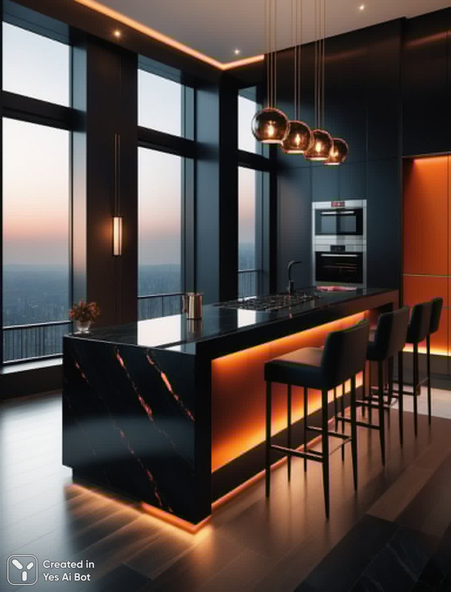 Роскошная кухня в стиле хай-тек, расположенная на вершине небоскреба, воплощает собой изысканность и современный дизайн. Интерьер кухни поражает своей мрачной элегантностью и ультрасовременной эстетикой. Центральным элементом пространства является огромный остров, выполненный из черного вулканического камня, внутри которого словно пылает лава благодаря оранжевой подсветке трещин из оникса. Глянцевые матовые черные кухонные шкафы и бытовая техника создают ощущение минимализма и совершенства. Драматическое теплое освещение подчеркивает текстуру материалов, добавляя глубину и объем. Современные стеклянные подвесные светильники с отражающими поверхностями дополняют атмосферу роскоши и изысканности. Высокие потолки и огромные окна открывают захватывающий вид на городскую панораму, а премиальный деревянный пол придает интерьеру теплоту и уют. Фотореалистичная детализация в разрешении 8K создает ощущение полного погружения в пространство, а кинематографическое освещение подчеркивает каждую линию и текстуру, делая этот интерьер идеальным для обложки журнала по дизайну. Насыщенная и мощная атмосфера кухни располагает к роскошному отдыху и кулинарным экспериментам, создавая неповторимый стиль и характер. Это настоящий оазис элегантности и комфорта на высоте птичьего полета