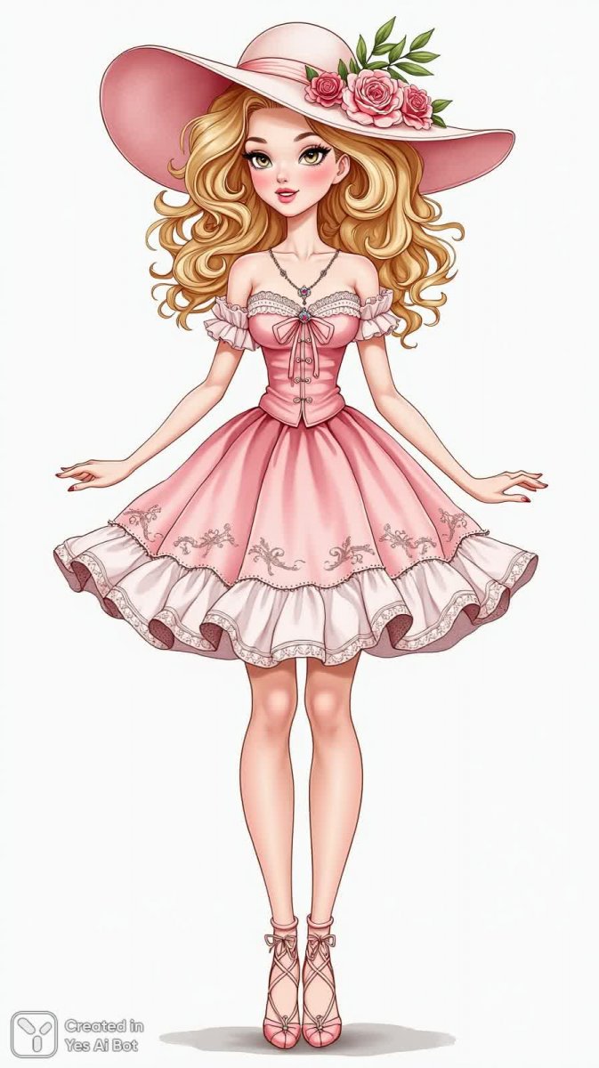 zentagle of doll with curly blonde hair, wearing a pastel pink outfit with ruffled hem and intricate lace details, large brimmed hat adorned with flowers, standing confidently, bg is white.