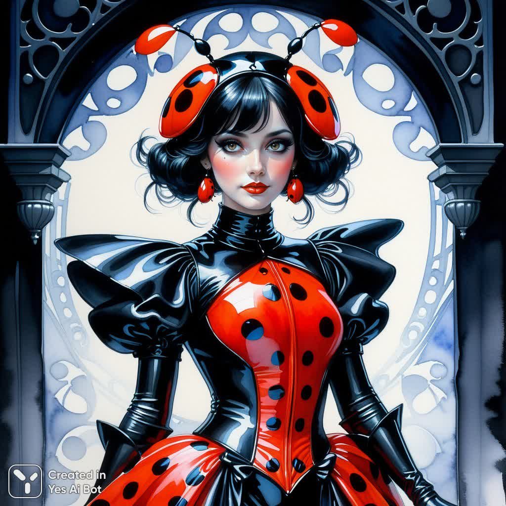 Загадочная женщина в костюме божьей коровки предстает на фоне глубокого черного цвета, создавая эффектную и запоминающуюся композицию. Использование акварельных и акриловых техник придает изображению особую текстуру и глубину, подчеркивая случайность позы и добавляя элемент непредсказуемости. Фигуру женщины дополняют элементы стиля Ацуко Кудо и Грега Хильдебранта, что привносит в образ оттенок готики и изысканности. Одежда с черными тонами создает контрастную палитру, выделяя фигуру на темном фоне и усиливая драматизм сцены. Женский силуэт, выполненный в гуманоидном стиле, притягивает взгляд своей выразительностью и загадочностью. Изображение выполнено в орнаментальном стиле, что добавляет произведению роскоши и утонченности. Вся картина пронизана атмосферой таинственности и элегантности, представляя собой уникальное сочетание различных художественных направлений. Это яркий пример современного искусства, где классические мотивы переплетаются с новаторскими техниками и смелыми решениями в области цветовой гаммы и композиции. В целом, работа производит сильное впечатление своей оригинальностью и мастерством исполнения. Она вызывает интерес и заставляет задуматься о скрытых смыслах и образах, заключенных в этом визуальном повествовании